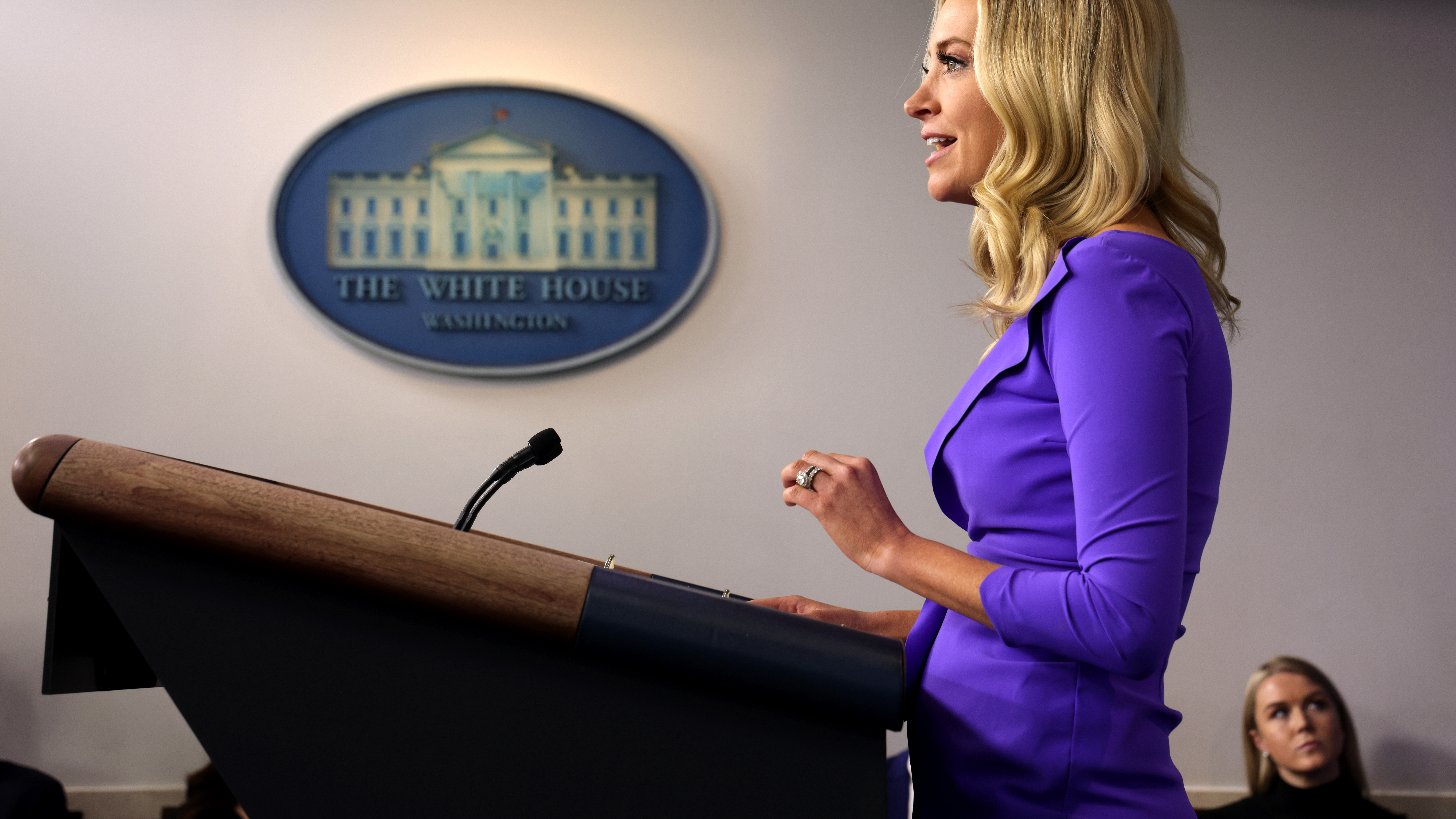 Leavitt sits to the right side of then White House Press Secretary Kayleigh McEnany as she holds a briefing at the James Brady Press Briefing Room of the White House.
